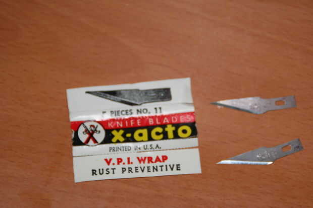 Cogí un paquete de hojas de X Acto 5-número 11 - por cincuenta centavos en un mercado de pulgas, y es que no tengo un cuchillo de x acto real, hice uno de un cepillo de dientes.