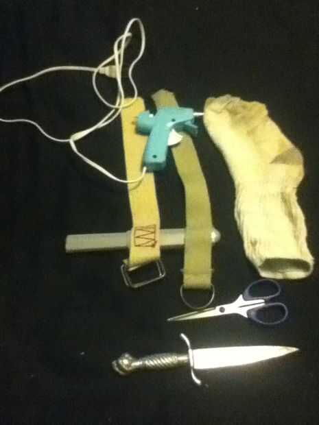Que tenga 2 correas, 3 calcetines (no tobilleras), espada de 1 juguete retráctil (el mío es el estoque de juguete de Indiana Jones y la Calavera de cristal) un pegamento caliente pistola, tijeras, un cuchillo (para cortar la espada)