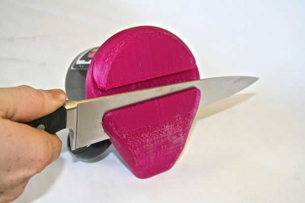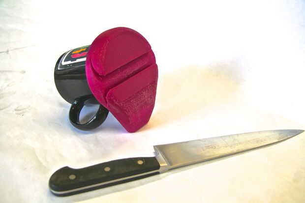 Después de romper de todo el material de apoyo, lo probé en uno de mis cuchillos. Tenía la taza cómodamente, pero tenía algunos problemas. Las ranuras para que el cuchillo eran demasiado flacas así el cuchillo no podía deslizarse hacia adelante y hacia atrás con suavidad. También, en posición horizontal la base era un poco demasiado pequeña para mantener todo estable. Decidí arreglar las partes en el diseño y también se mueven en una impresora de resolución más alta.