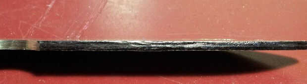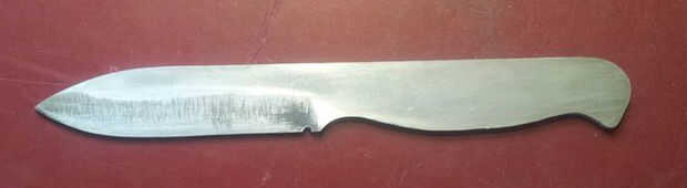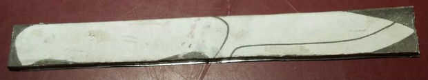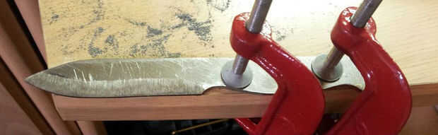 Marque la línea de centro de su bisel asegurándose de dejar en el lado más grueso para evitar la deformación durante el tratamiento térmico. Marqué el punto a archivo marcando el borde con un marcador de arrastrar luego una pinza a cada lado. Lo mismo puede hacerse con una broca en una mesa plana. Sujete el borde de una mesa y archivo el bisel.