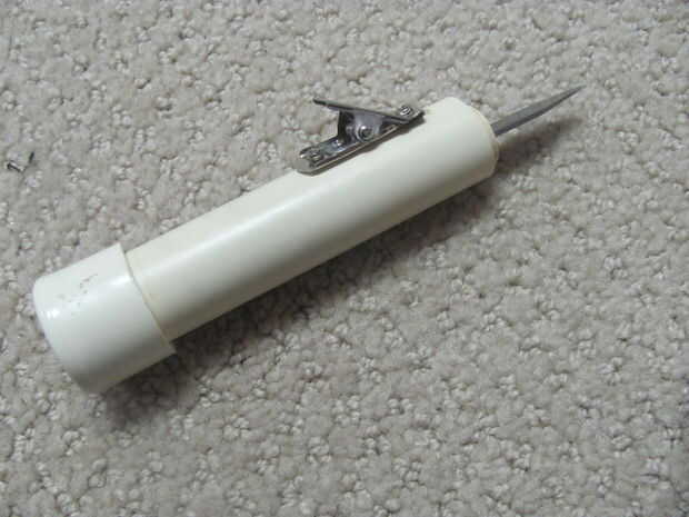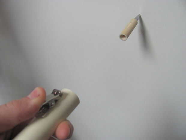 este es un mini cuchillo balístico procedente de suministros de oficina. La parte de ejercicio no sólo sería el mondadientes. Pros - fáciles que provee Cons - rango 5-7 pies (o alrededor de 1.5-2 metros) - 'cuchillo' girará hacia fuera después de 5 p