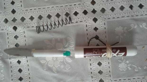usé un marcador expo y una pistola de resorte. Para el disco que utilicé una tapa de pluma y una cuchilla de una navaja.