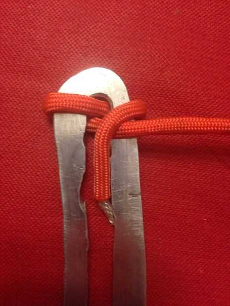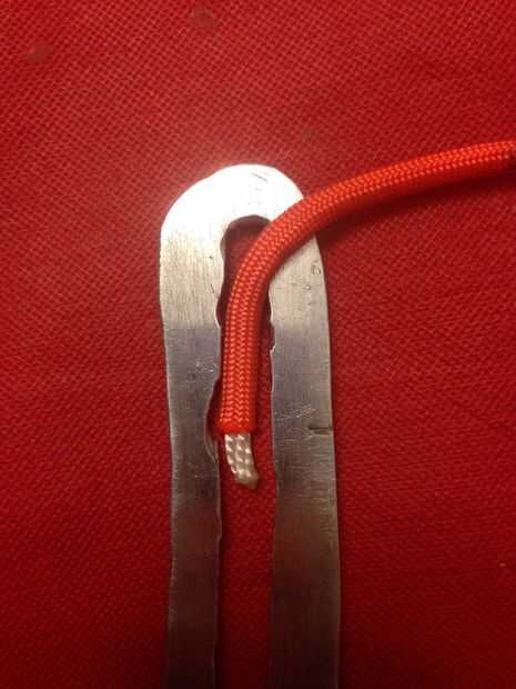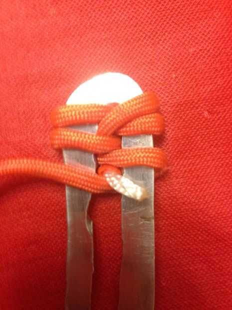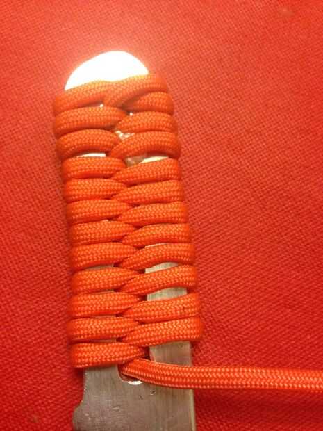 Ahora a la parte donde utilizas realmente el paracord. Esto se puede también hacer con el cuero pero ya que este es el reto de paracord usé paracord. Así que empieza con aproximadamente una pulgada si la 6 sección de paracord y ponerlo en la ranura en el extremo de la caña. Luego proceder a tejer el cordón por asegurándose de mantener la pulgada de cable en la ranura y asegurándose de que mantenga la tensión en el cable para que la pulgada no viene a través. Asegurar que un ", debajo, encima, bajo" tipo patrón tanto como lo haría en una pulsera de trenza cola de pescado. Al llegar el extremo de la ranura más cercana a la hoja seguir al siguiente paso.