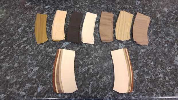 Decidí ir por un tema de claro - oscuro - luz, por lo que cada laminación a continuación contrasta el uno al lado. Jugar, ir por algo elegante, luz a oscuras en el mango entero, la elección es suya. Incluso podría utilizar madera teñida para crear un patrón de arco iris!