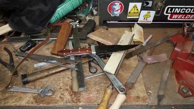 Soldadura martillos de antorcha, yunque, Misc, una buena Sierra para metales, un par de archivos diferentes, una lijadora de banda craftsman, amoladora de ángulo sostenido de mano, pinzas, rueda que pulimenta (puerto de carga) y mi fiel amoladora DeWalt.