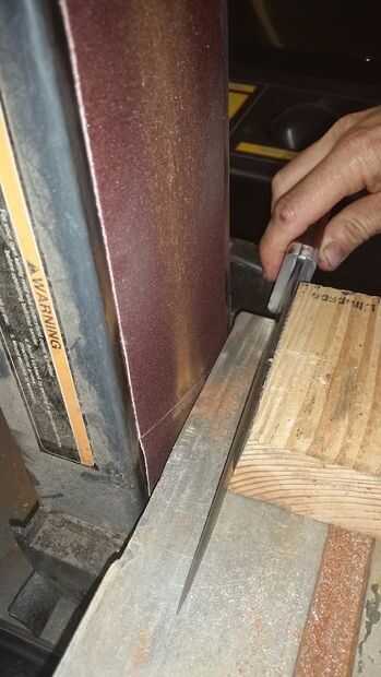 Así que aunque con mi 2 x 4 'jig' siempre debe asegurarse de que estoy presionando la hoja contra la lijadora de banda paralelo a la banda.