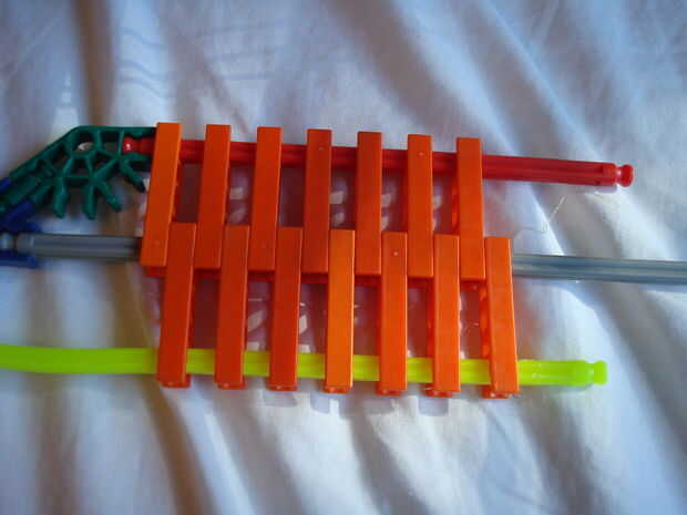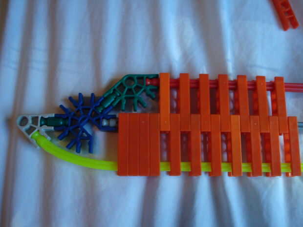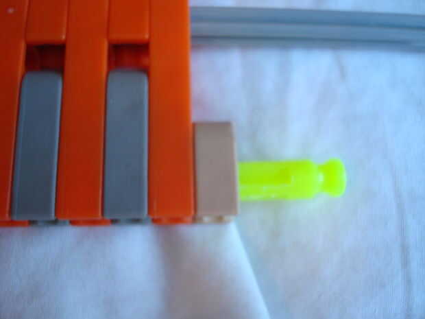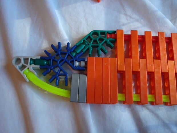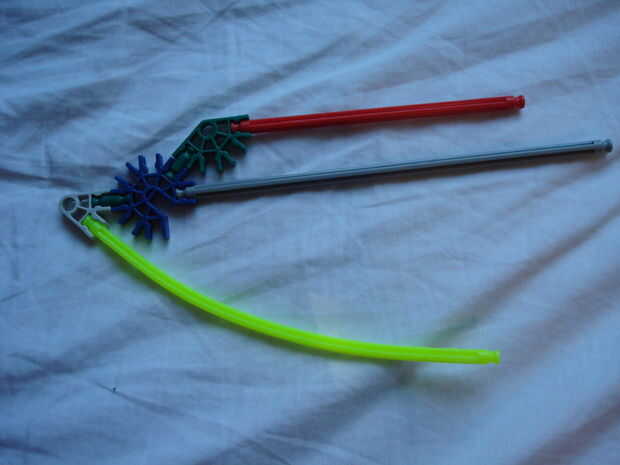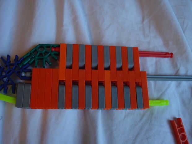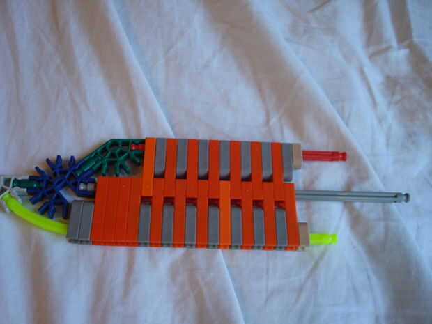 este cuchillo KVG es muy fácil de hacer y es bastante fuerte. Necesita: 10 conectores azules, 1 conector blanco oscuro, 1 conector verde, 3 conectores amarillo, 2 conectores naranja, 2 barras amarillas, 2 barras blancas, 3 barras verdes, 1 barra roja