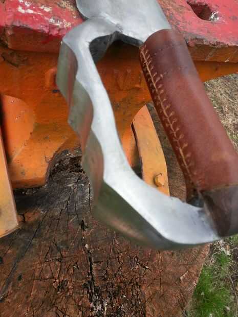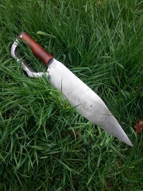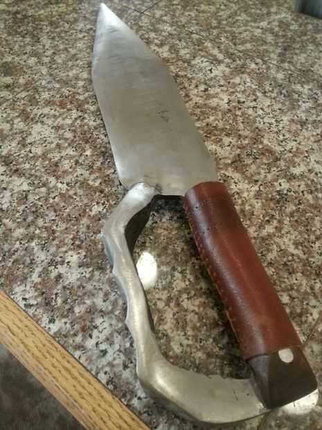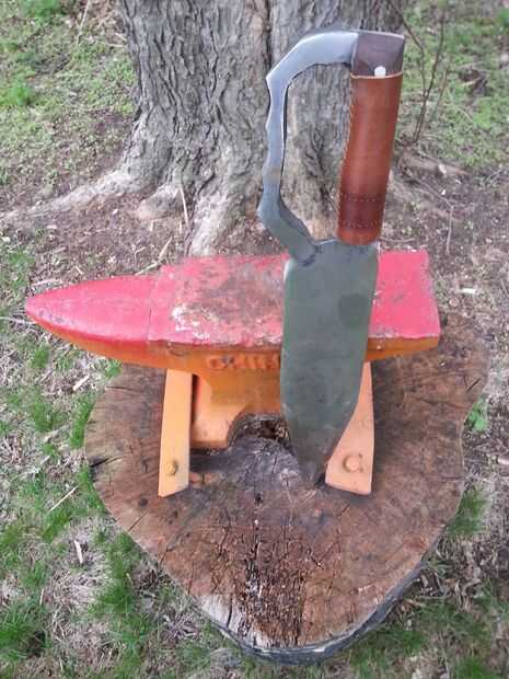 esta construcción utiliza materiales totalmente reciclados. Proviene de la cuchilla y resorte de carro viejo, pero mi enfoque es la tuerca forjada en una guardia. Esencial para esta creación es un soldador, pero más allá de eso, se necesita sólo una fragua simplemente. Todo lo restante se puede hacer con herramientas comunes.