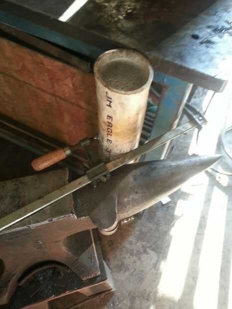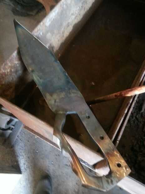 Usé un soplete de propano para tirar de la dureza, calentando el centro de la hoja a un color ciruela mate.