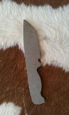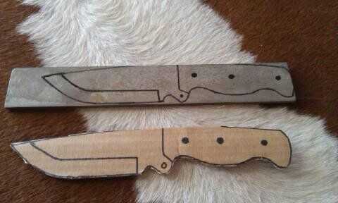Encontré un diseño que me ha gustado y puño copiarla en algún cartón para obtener la sensación del cuchillo. Después de hice algunos pequeños ajustes en el diseño para que el mango encajaría en mi mano. Cuando yo era feliz con mi diseño remonta a mi acero, que es un acero al carbono 1075. Me corte con una sierra para metales y refinó su forma con los archivos. Taladré agujeros en el mango en esta etapa por lo que puedo clavar mi mango en más tarde.