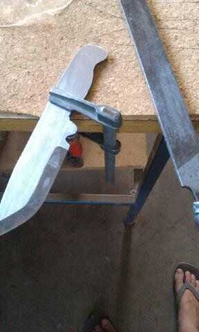 Para moler los cartabones sobre la cuchilla marqué a donde yo quería y reprimieron el cuchillo sobre mi mesa de trabajo. Utilizar la amoladora angular para esto y me fui lentamente y con cuidado, comprobar regularmente paradero que estaba y qué estaba buscando. Es muy importante prestar atención a este paso porque si usted cosas aquí entonces básicamente arruina cuchillo usted a menos que desee cambiar totalmente el diseño. para tomar realmente su tiempo. Yo suelo a cerca de 80% y los archivos que se utilizan para hacer el resto. Cuando limpiando los biseles con un archivo utiliza un empate presentación técnica, que consiste en dibujar el cuchillo perpendicular al borde de la hoja, ayuda a deshacerse de arañazos profundos dejados por el molino y también para mantener un bonito borde recto.