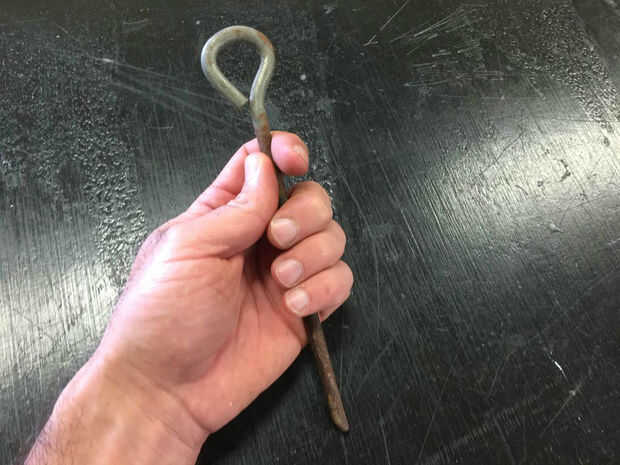 En primer lugar, cortar el ojo de la armella. Compruebe el cuadro para un cierre para arriba. Me olvide de este paso con una foto del documento por lo que he editado la foto para ver como lo hizo, antes de soldado con autógena, para el arado.