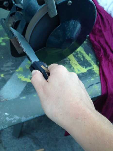 Uso una esmeriladora de banco primero para un afilado áspero usar archivo y papel de lija para una cuchilla de agradable pero estoy ir tengo poco contundente porque voy a utilizarlo para cortar ramas