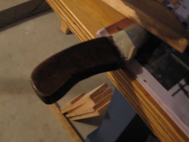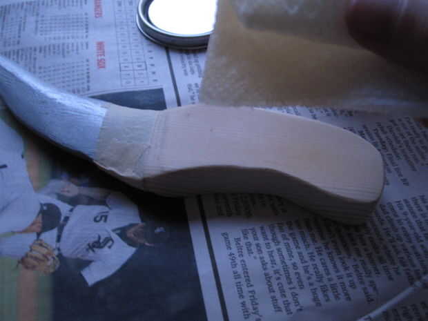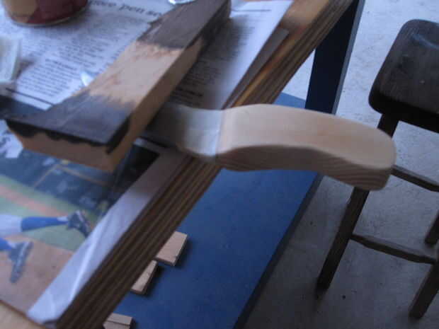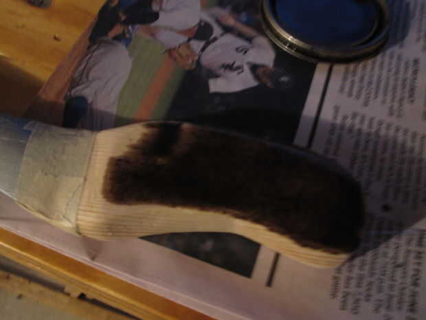 Para mí, que quería utilizar un colorante para hacer este parece de madera marrón oscuro. Me tomó unas latas para calcular hacia fuera cuál funcionaría mejor (yo usé un tinte llamado "Nuez especial"). Aquí es donde sus recortes mano, como puede mancharlos y obtener una idea bastante buena su mango como se verá.