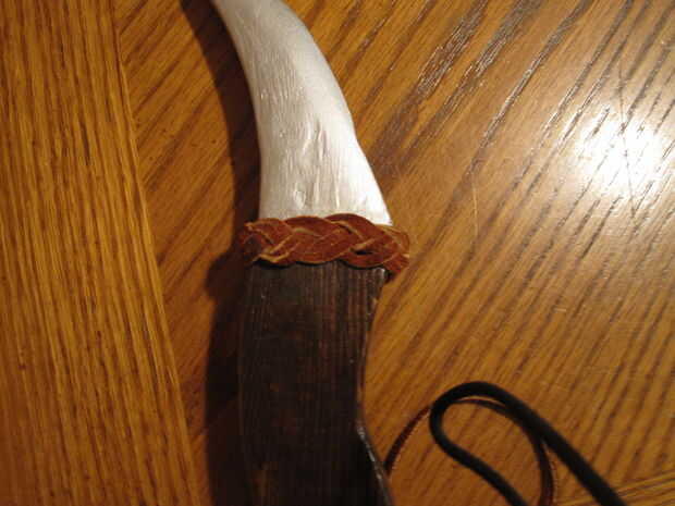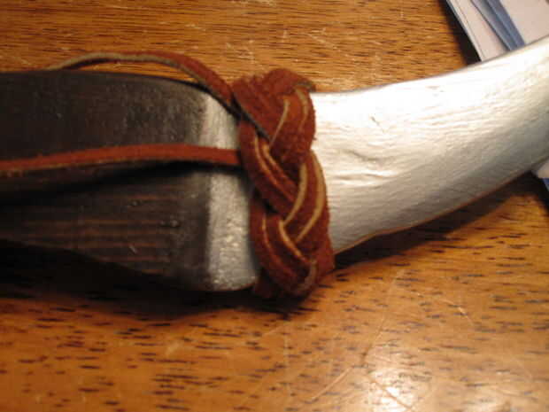 Usted simplemente podría parar en el último paso, pero quería también darle la manija del cuchillo una envoltura de cable de cuero para decorar un poco más. Tengo cierta habilidad con lazos y decidió ponerla a utilizar con este proyecto. Si no tienes tal habilidad en lazos, o no piensas que ir a través del esfuerzo, puede omitir este paso.