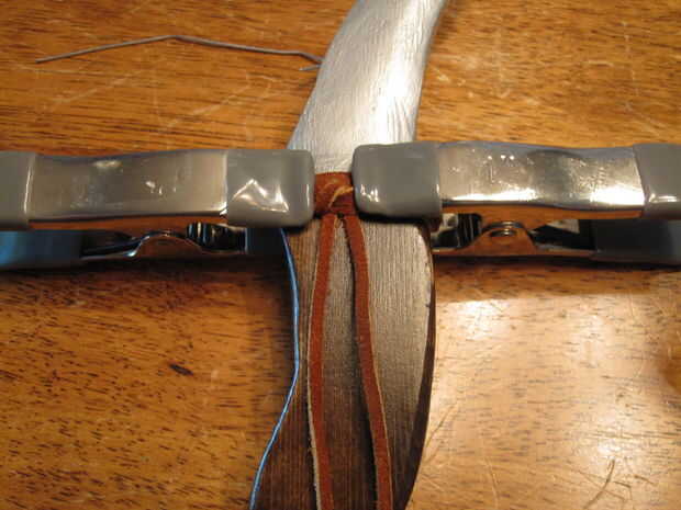 Me gusta atar el nudo en mi mano y periódicamente lo empujó sobre la cuchilla en la posición en quería mantener el tamaño necesario. Después fue atado el nudo, usé algunos 'cemento cuero' para mantenerlo en su lugar en la hoja. Si no tienes esto, pegamento regular, epoxi o pegamento podría funcionar igual de bien. Me asegura con algunas abrazaderas de resorte de 1" y deje que se seque. Si no cumple lo suficiente, puede aplicar un poco más de pegamento en el nudo y amarrarla otra vez.