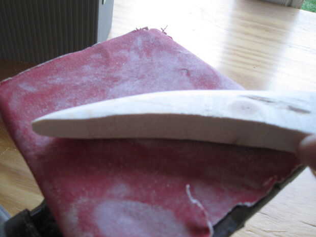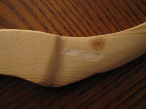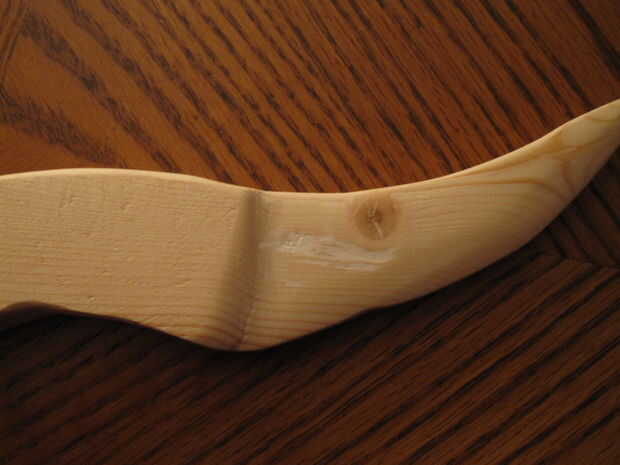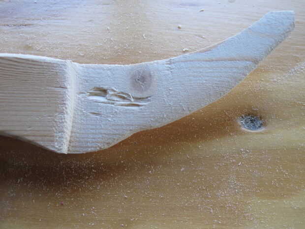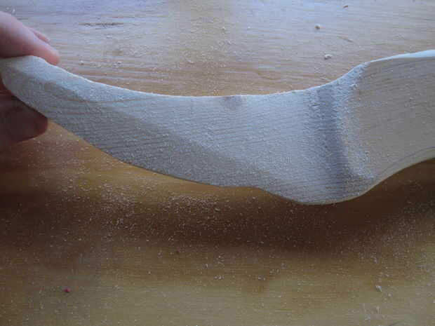 Así, después de mucho lijar, he conseguido quitar el cráter feo a un lado y estrecho del otro lado hasta un cráter mucho más pequeño que yo después rellena con masilla para madera. Durante este proceso de lijado, seguir adelante y tratar de forma cónica de la lámina de la espina dorsal a la lámina para darle una forma más realista.
