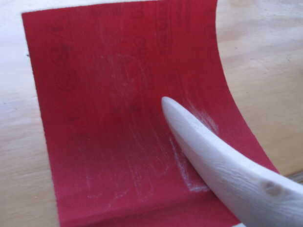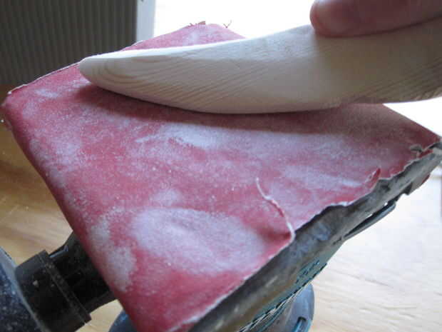 Comenzó con grano 40 para desprender los trozos más grandes de material, utiliza 100 grano y grano 150 para alisar hacia fuera y había terminado de la superficie por lijado con grano 220 a mano.