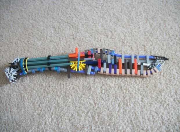 este cuchillo KVG es muy fácil de hacer y es bastante fuerte. Necesita: 10 conectores azules, 1 conector blanco oscuro, 1 conector verde, 3 conectores amarillo, 2 conectores naranja, 2 barras amarillas, 2 barras blancas, 3 barras verdes, 1 barra roja