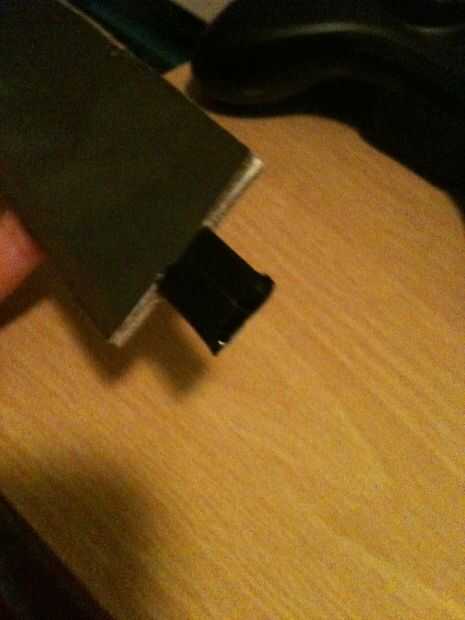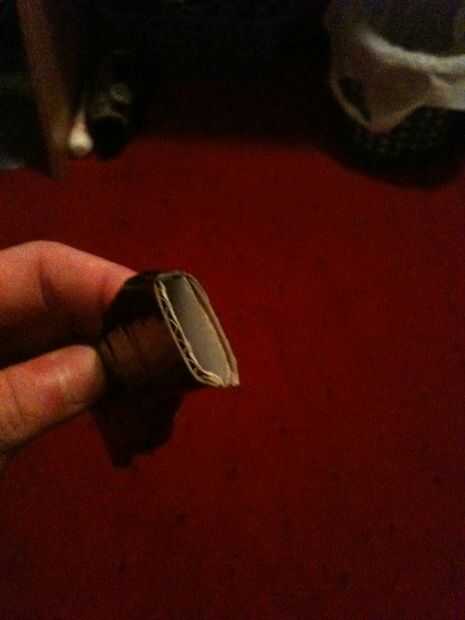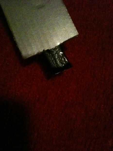 Obtener las 2 cuchillas y únalos con cinta adhesiva las partes finales. Entonces usando pegamento stick el resto juntos. Los tiradores para poner un un pice delgada de cartón que es 3/4 de la longitud de las asas entre luego con cinta adhesiva. Debe existir una holgura en la parte superior como se muestra. La parte final de la hoja debe ser capaz de encajar en la ranura en el mango. Yo no pegue la hoja en el interior así que puedo tomarlo hacia fuera cuando quiero, pero puede pegar si quieres
