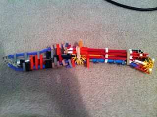 este cuchillo KVG es muy fácil de hacer y es bastante fuerte. Necesita: 10 conectores azules, 1 conector blanco oscuro, 1 conector verde, 3 conectores amarillo, 2 conectores naranja, 2 barras amarillas, 2 barras blancas, 3 barras verdes, 1 barra roja