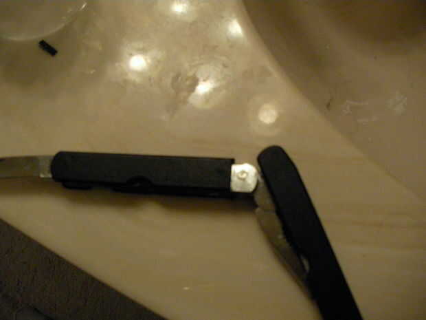 Primero se corta la cubierta plástica de donde el brazo se conecta con los alicates. Este había denostado un remache. Trabajo de remaches bien pero son un dolor para poder salir, bueno no supone salir de todos modos. Tomé un archivo y comenzó a moler la cabeza de los remaches.