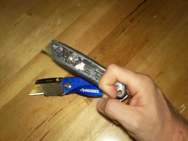 2) las nuevas pocket estilo cuchillas. Estos son excelentes! (Sólo tal vez no para este propósito.) Pliegan tan conveniente y la hoja puede ser intercambiada hacia fuera con el toque del botón. Sin embargo tienen un par de inconvenientes para este proyecto: en primer lugar, no hay lugar para almacenar hojas extra como los otros cuchillos. En segundo lugar, se puede incluso utilizar una rutina ambidiestro en la hoja porque la espalda todavía sería capaz de cortar cuando dobla.