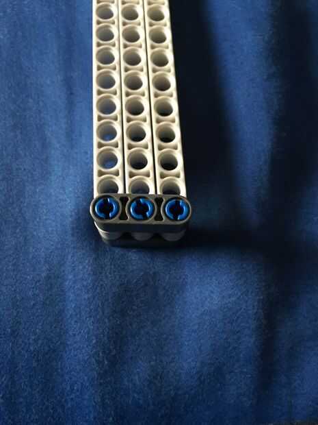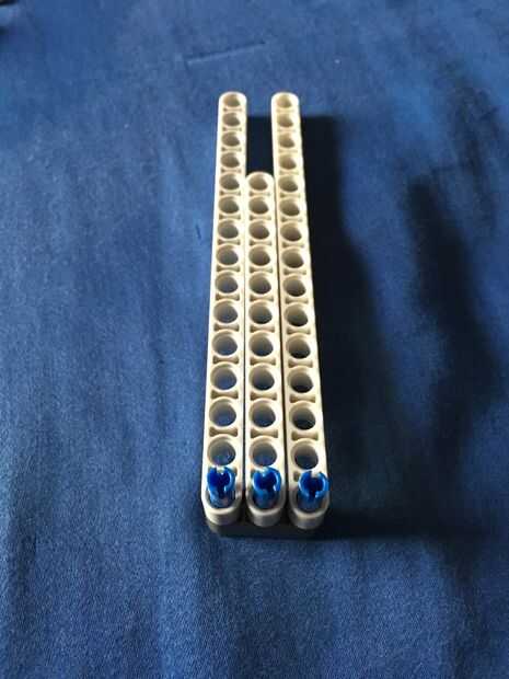 El primer paso es crear el "pivote". Para crear esto, utilice sus tres pinos y con el lado corto ponerlos en la viga largo 3 Añada las vigas que se muestra y luego añadir el rayo largo tres en la parte superior.