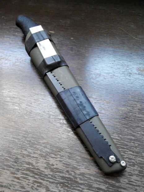 No llevo un parang en caminatas extendidas, sólo un cuchillo pequeño para ahorrar en peso. Con este mod, se puede incorporar una sierra que puede procesar la madera hasta 4" de diámetro, hacer trampas y una piedra para mantener el borde de la navaja. Los tubos interiores también podría utilizarse como arrancadores del fuego.