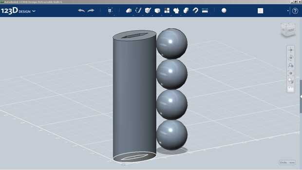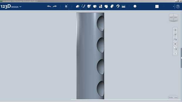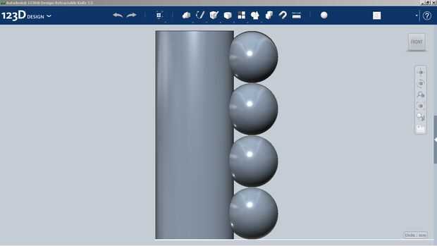 En este paso, tomé la base esbozada que creó para la manija y sacó un sólido arriba de él. 123D diseño hace realmente fácil de crear, mover y manipular objetos. Por ejemplo tomé el óvalo sacado y utiliza 4 esferas para cortar apretones del dedo en el mango con la opción de combinar (restar). Ahora hay 4 hoyuelos en el mango, pero son ásperas. En este caso usted puede suavizar los bordes con la herramienta de filete, mina filete.384 grados.