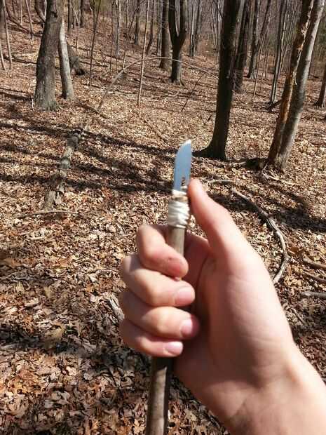 esto es un cuchillo de supervivencia que hice con cosas de mi lata de la supervivencia y algunas cosas que puedes encontrar en la naturaleza. No es el cuchillo más grande, pero su muy útil, usted puede limpiar su pescado, usted puede cortar madera o