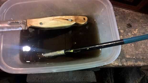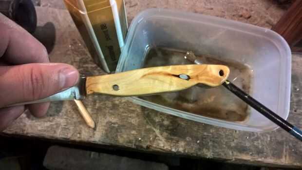 Si utiliza aceite danés aunque, será necesario una bañera de Tupperware de algún tipo, un pincel fino (un cepillo pequeño brillo funciona bien) y un aceite danés - obviamente. Para empezar Vierta una buena cantidad de aceite en la tina y coloque el cepillo en ella para empezar a remojo, agarra tu cuchillo y limpie cualquier polvo o suciedad con un trapo de algunas clases. Una vez que el cuchillo esté limpio, coloque en el aceite y haga espuma la madera totalmente, realmente trabaja el aceite en la madera. Aplicar el aceite para un par de minutos luego déjela reposar unos minutos más, aplicar más aceite de la misma manera que antes y luego dejar el cuchillo sentado en el aceite durante unos 20 minutos. Volver a la pieza cada 20 minutos o así y bien apague la manija otra vez, hacerlo rutinariamente para las próximas horas - ir y hacer algo más, entonces volver, aplicar más aceite e ir otra vez. Después de varias aplicaciones de la madera comenzará a oscurecerse ligeramente y el patrón del grano aparece más vivo, esto significa que el aceite está penetrando la madera - esto es bueno. Evitar aplicar aceite de más y más hasta que la madera se ve como si puede sumergirlo hasta no más, entonces da unas cuantas aplicaciones más sólo para asegurarse. Deja el cuchillo sentado en el aceite durante otros 20 minutos o así antes de una capa final, limpie del exceso aceite esta vez con un trapo y sujetar el cuchillo por la hoja, en un vicio en un ligero ángulo que cualquier filtración puede ejecutar de la manija. Coloque la bañera debajo para recoger el exceso de aceite que filtra de la madera y dejar el cuchillo de un absoluto completo 24 horas mínimo. Si su taller es frío y húmedo y luego el aceite lo más probable es no curar, así asegurar es bastante seco y moderadamente cálido ambiente para el curado de proceso.