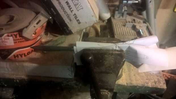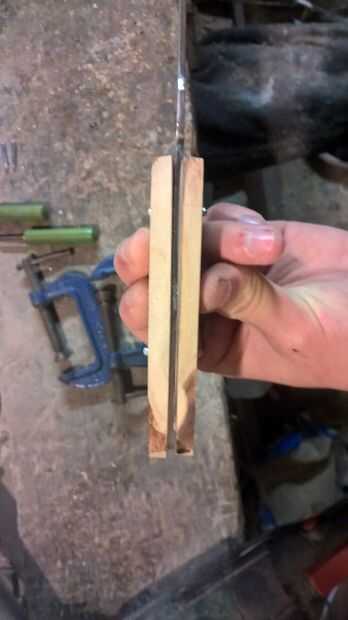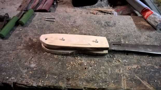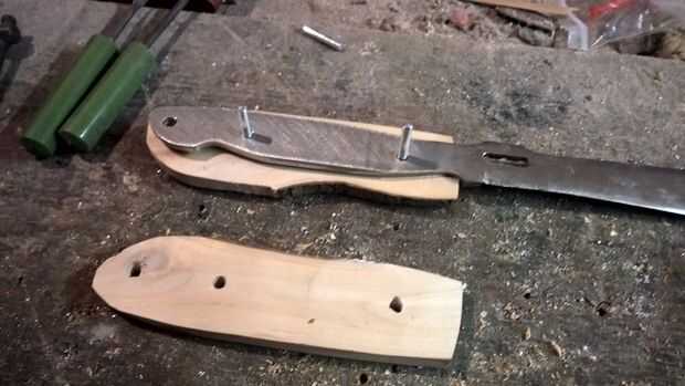 Sujetan firmemente el mango y luego coloque el conjunto sobre una superficie sólida, preferentemente metálica, con las clavijas que toca esa superficie - un yunque o tal sería una superficie perfecta. Usar el martillo de pein de la bola para golpear las cabezas que sobresalen de los pernos de la manija 4 o 5 veces, luego voltee el cuchillo y lo mismo otra vez en el otro extremo de las patillas. Mantenga repitiendo este paso hasta que ambos extremos de las barras han quemado uniformemente hacia fuera sostenga firmemente las escalas a la tang, ahora envuelven el mango en papel y sujete firmemente en una prensa durante al menos 24 horas curar totalmente. No te preocupes si las clavijas aún sobresalen ligeramente de la pieza de trabajo, se lija al ras de la madera posteriormente, asegúrese de que el metal ha quemado lo suficiente como para llenar el agujero un poco más grande, de 4mm en la escala.