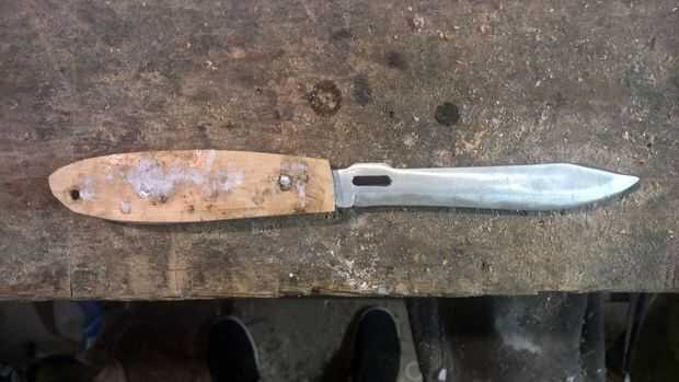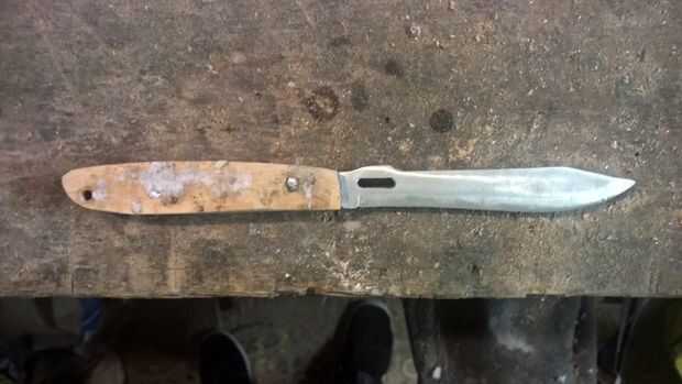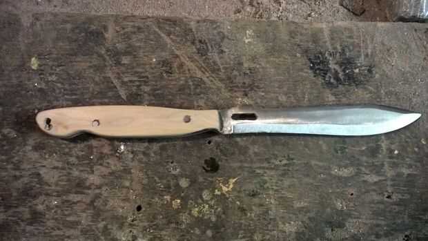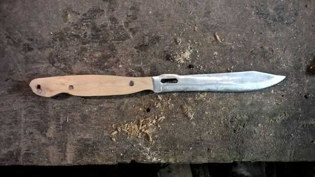 ** Nota: Me las arreglé para desordenar el paso anterior también - estoy en un rollo - cuando quema las cabezas de los pernos para fijar las escalas, no tomo mi tiempo y terminó doblando ambos pernos de la manija causando tanto las escalas que se desvían de su posición correcta. Esto fue en parte porque la nueva escala que hice tenía una sección suave, justo al lado de donde decidí hacer mi agujero de la manija, pero fue debido principalmente a mi que acomete el último paso y no comprobar mis progresos con la frecuencia suficiente. He logrado reducir los daños esto algo lijando las escalas mucho más fino que planeado originalmente, trayendo las clavijas un poco más en la alineación, pero no son como deberían y eso ha arruinado mi mango de cuchillo.