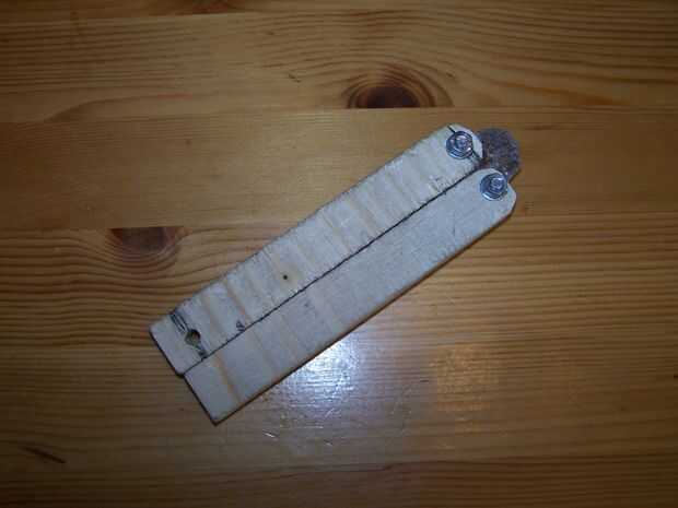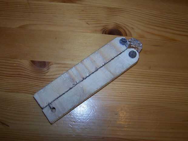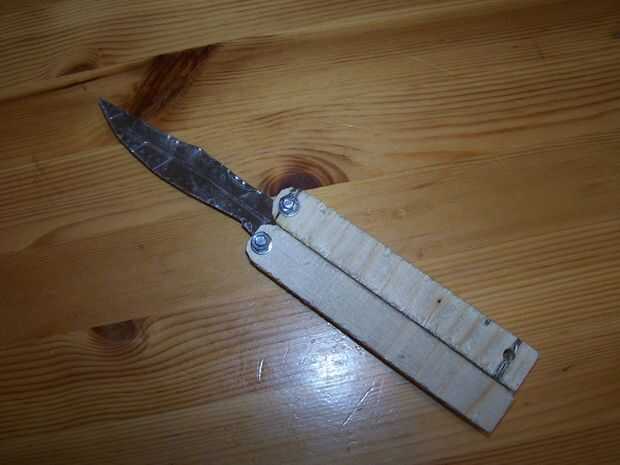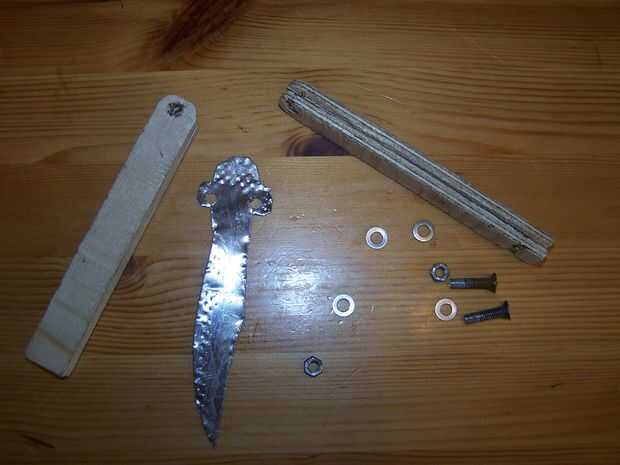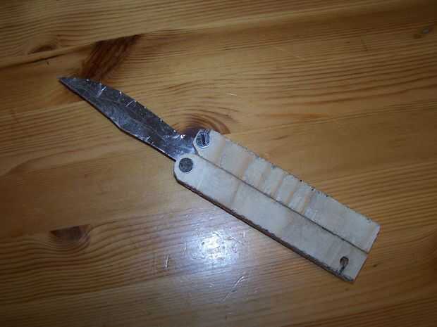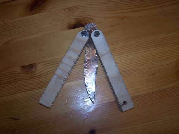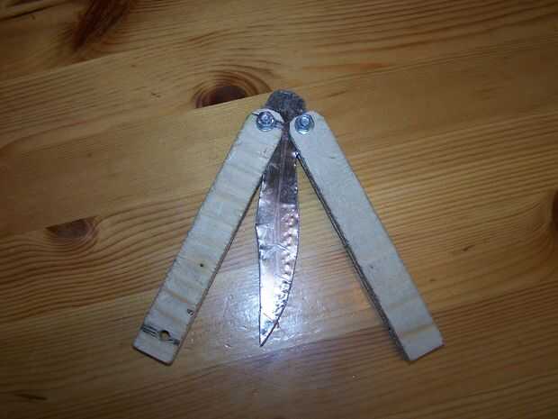 un balisong de práctica hice uso hasta soy capaz de conseguir uno real. Utiliza herramientas limitadas y restos de madera. Sólo herramienta que utilicé fue un simulacro ahora que lo pienso.He utilizado clavos cortados como pasadores de espiga. Set de