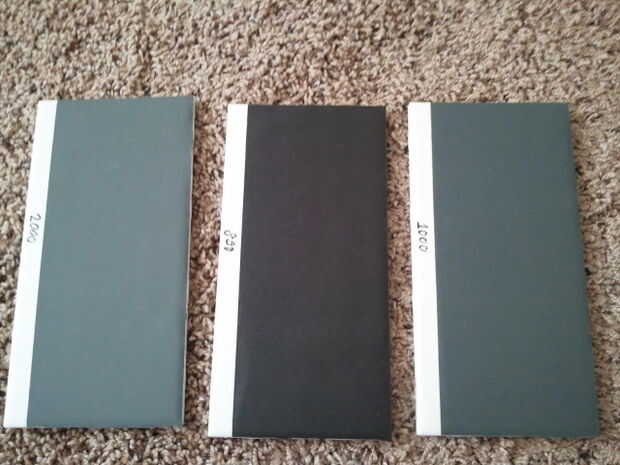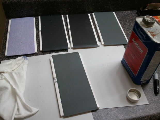 Aclarar y repetir para cada conjunto de papel de lija que se utiliza. Utilice un rotulador para etiquetar cada azulejo. Recuerde, cuando usted es afilado habrá agua en éstos, por lo que no quieres tener que darles la vuelta para ver que usas el azulejo afilado.