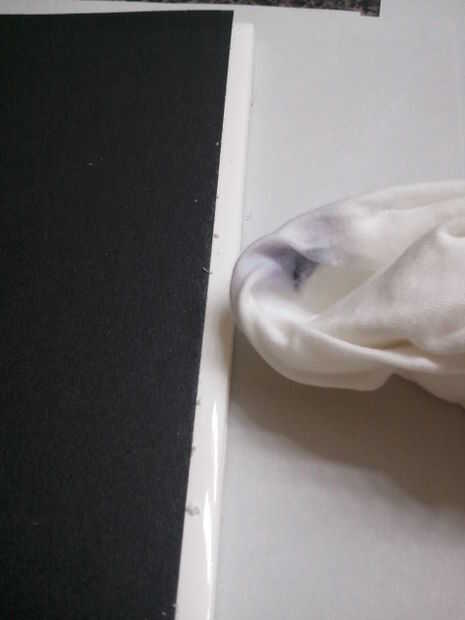 Después han unido el papel de lija a la baldosa, rápidamente subirse su algodón con acetona y remover el pegamento de aerosol del resto de la baldosa.