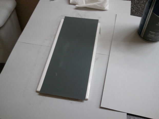 Lugar algo encima que costumbre colocar spray adhesivo o serían fácilmente quitado (papel de cera, plástico, etc.) y poner un peso plano grande que comprime el papel de lija hoja sobre el azulejo y deje que se sientan y curar. He utilizado una hoja de plástico de un paquete de papel de computadora, colocada un libro en la parte superior y entonces poner en 20 libras de un peso situado en la parte superior.