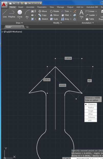 Ahora comenzaremos a construir los bordes de la cuchilla. Le haremos las mediciones en la primera foto para hacer los bordes. A partir de la parte superior de la línea nueva y hacer una nueva línea que es 4,0355 pulgadas antes de que usted haga clic en entrar haga clic en el botón para establecer el ángulo que la línea será en y tipo 45. Ahora si lo has hecho esto correctamente te darás cuenta que las 2 fotos no son exactamente iguales que porque los bordes no redondeados aún. Pronto llegaremos a eso.