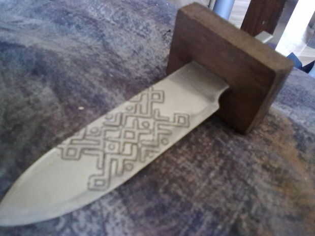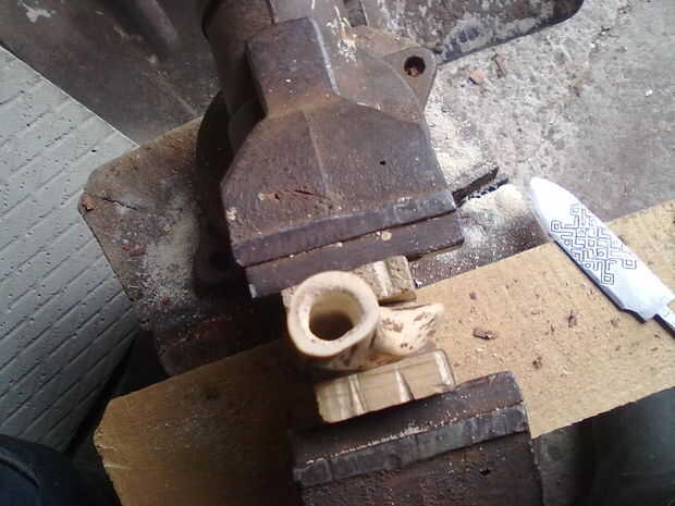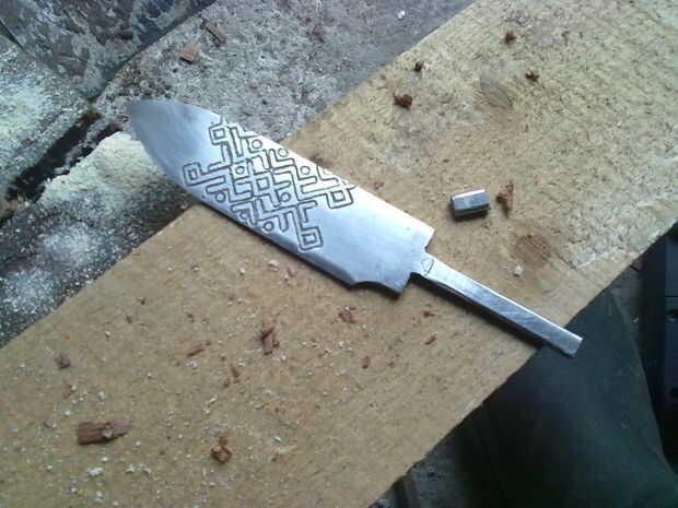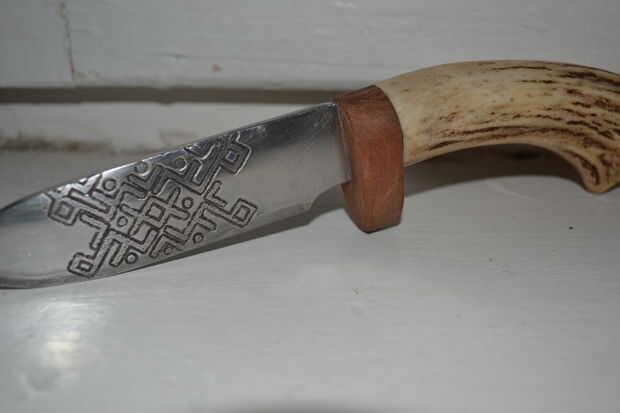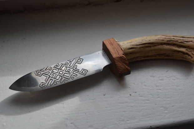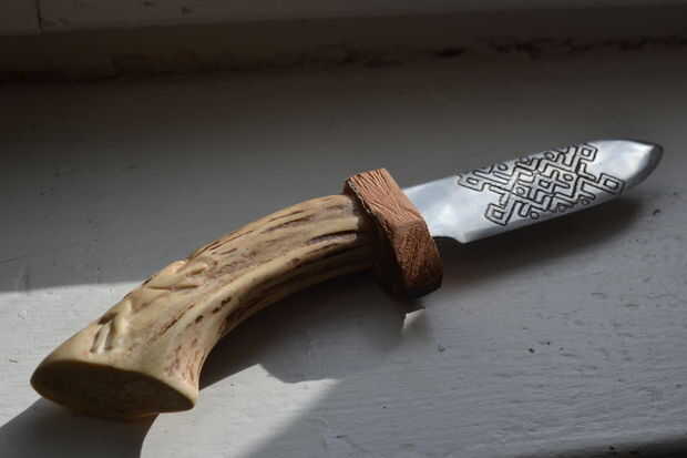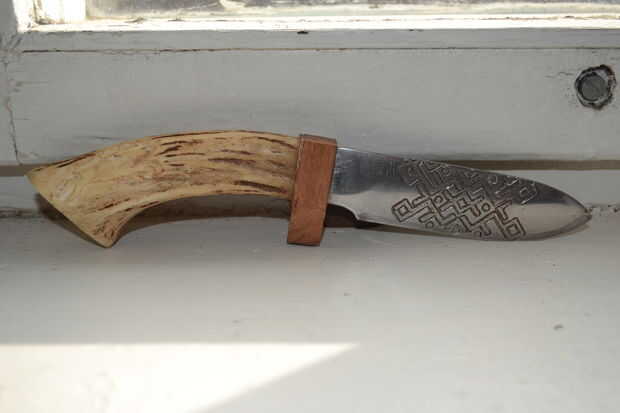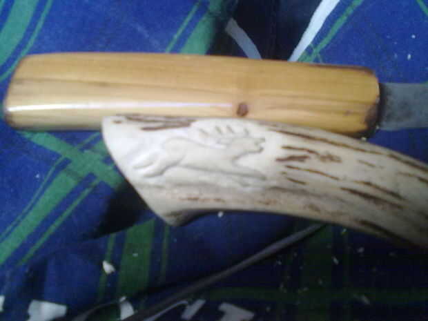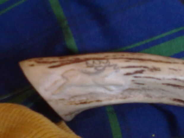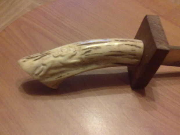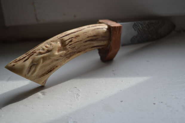 Entonces, con cuchillo, comenzó tallando un ciervo en la empuñadura.