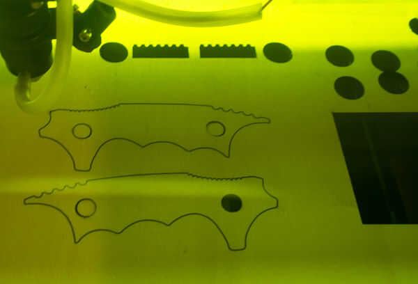 Ver a través de la ventana de teñido del cortador del laser del HPC3050, las manijas de la karambit están listas para pop fuera de la hoja de madera contrachapada de 6 m.