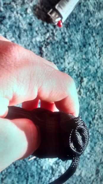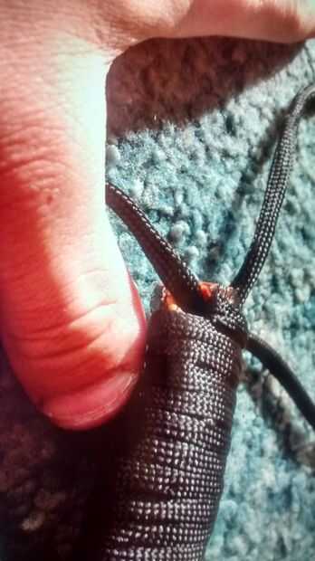 A continuación, sólo uno de los extremos de paracord para el lado de la lámina de la manija del derretimiento y envuelva firmemente y suavemente hacia el lado de la empuñadura del cuchillo. terminar por ir a través de su agujero para dejar una pulsera cordón o cuerda luego arrollar el cable hasta el final del cuchillo y la miel un poco en la parte posterior para hacer el paracord permanecer en el lugar de fusión.
