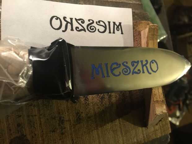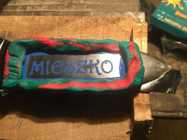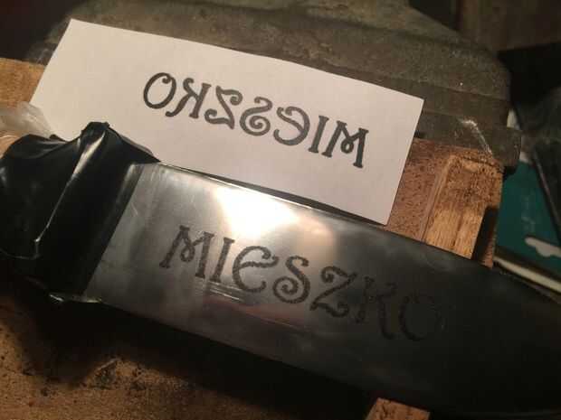 Hago texto e impresas en impresora láser. Transferencia de texto en egde con heatless termotransfer, similar como el PCB. Corregir utilizando pintura de oi, "tanque" de plastilina de la escuela, luego hacer solución de sal. Poner la solución en el "tanque". En ahora nosotros necesitamos fuente de alimentación, utilizar fuente de alimentación ATX vieja. Conecte el cable positivo al borde y negativo a la barra de acero. Poner barra de a solución y mueva lentamente sobre el borde.