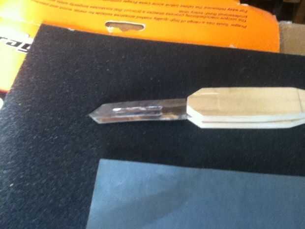 Una vez que la hoja es agradable y fuerte. Obtener su localización de la manija el centro del lado corto ponerlo en la prensa de corte una línea por el medio lo suficiente como para que la hoja puede caber en perfectamente el pegamento pva uso sujetarlo vice lo y dejarlo durante la noche. Listo. Barniz y lijar si lo desea. Gracias y si tienes alguna duda por favor deje un comentario. Hasta la proxima