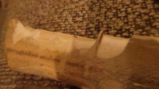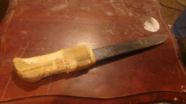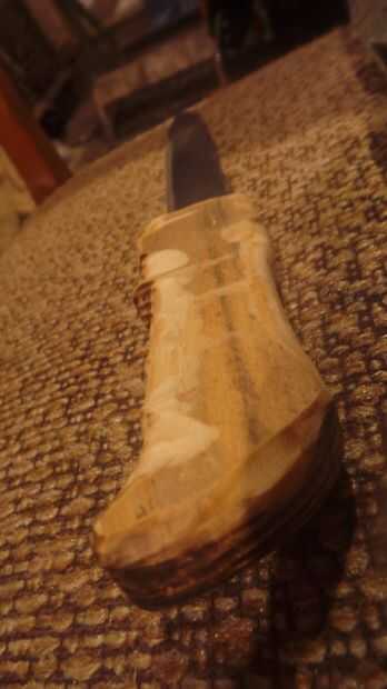 Marcar en la madera donde Envuelva sus dedos alrededor de él y luego usando la rueda del molino para moldear las curvas y restregar para que coincida con su puño. Hacen para que los dedos se sientan cómodos y moler las superficies de la madera suave para que su palma quede sin ningún dolor punzante de las esquinas o las astillas. Finalmente puede estrechar el pomo con un diseño que te gusta, personalmente fui una especie de cuchillo de combate de aspecto.