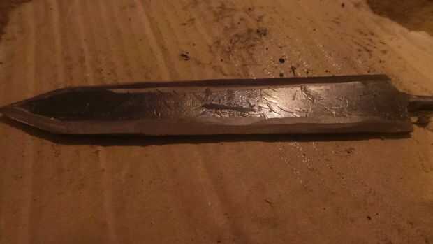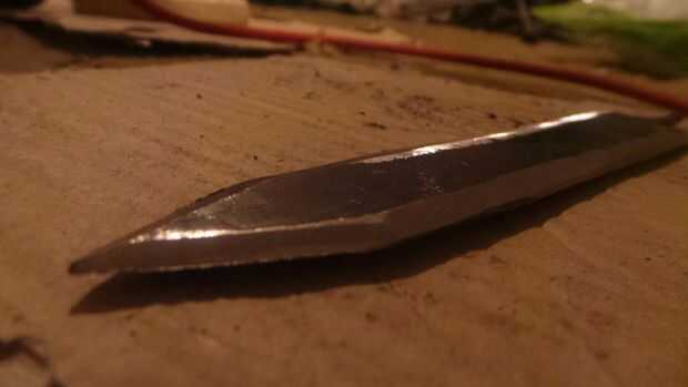 Había biselado a un punto y trató de añadir una fuller que eventualmente se perdió en el material que fue afeitado apagado. Luego me fui a la rueda del alambre, papel de lija y rueda que pulimenta para conseguir el brillo. Simplemente, use su esmeriladora y lijadora para hacer biseles muy pesados para caber la forma de algunas dagas hechas profesionalmente.