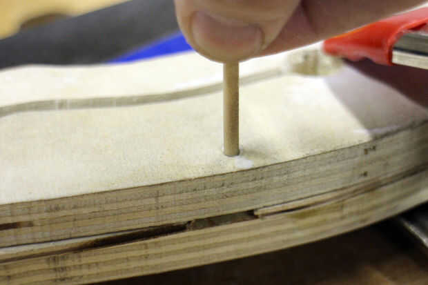 Utiliza pegamento para madera en los separadores, las dos manija mitades se presionan juntos. Clavijas de madera fueron martillados en los orificios taladrados para asegurar los dos lados. Deje que el pegamento se seque por completo.