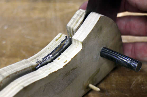 Después de que el pegamento se secó y tuve oportunidad de probar la acción bloqueante noté que algunos de la madera en el extremo del canal bloqueo llevaba lejos, haciendo la fijación descuidado. Con la hoja completamente extendida hice una cuña de metal pequeño que fue epoxy pegado dentro del extremo del canal de la cerradura, este bien sujeto el disco bloqueado abierto cuando esté en uso.