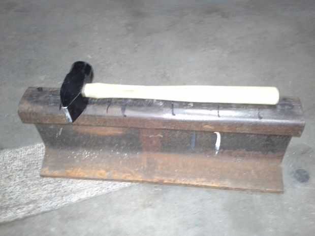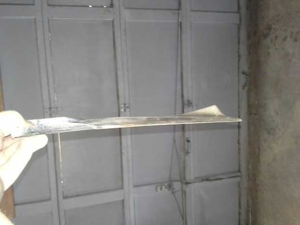 Una vez que se selecciona una hoja corte por la mitad para que sea más fácil de manejar, algunas personas se utilice una hoja completa e incorporar el centro de los agujeros de montaje en su diseño. Para obtener la hoja recta calienta lo en una cama de brasas hasta que dio vuelta a un rojo embotado y había martillado en un trozo de pista del ferrocarril que utilizo como un yunque. La hoja entera caliente, asuma siempre que la hoja esté caliente salvo prueba cool.  Una vez que la hoja es recta "suficiente" me dieron la brasa roja caliente y calienta la hoja hasta que fue no magnético, entonces que el fresco de la hoja con el carbón durante la noche. Esto hace que la hoja suave y más fácil de perforar y hacer un cuchillo en forma de objeto.
