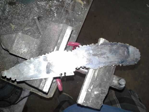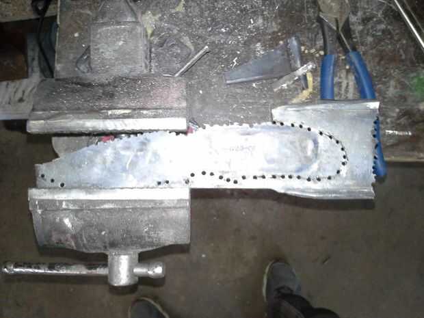 La forma de la lámina dependerá de cómo lo vaya a usar el cuchillo. Sabiendo que esto es un acero más suave que deciden hacer un cuchillo que acampa, en eso es duro, pero no frágil. Una vez que se escoge una forma de transferir al metal, utilicé un fabricante de pintura. Luego perforé a lo largo de la marca cada trimestre pulgadas o menos para facilitar el corte de la cuchilla para mí. Si tienes una sierra de banda entonces usted puede apenas áspero hacia fuera el perfil. Utilicé una herramienta giratoria "Dremel" para cortar entre los agujeros. Excepto los desechos de los necesitará más adelante.